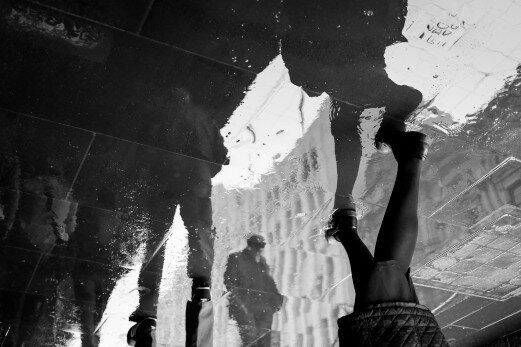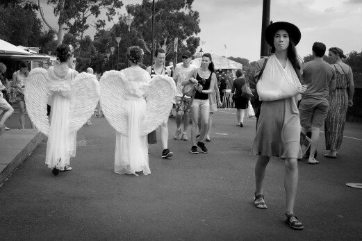 Even when it rains, there is always something fascinating to capture – like abstracted reflections of people hurrying around with umbrellas in Bourke Street or when you least expect it, seeing the irony of two angels and a young woman with a broken arm walking in opposite directions in Federation Square.