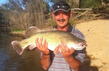 Father of the bride, Peter Ridsdale, catches his first legal size Murray Cod on the last day of wedding celebrations.