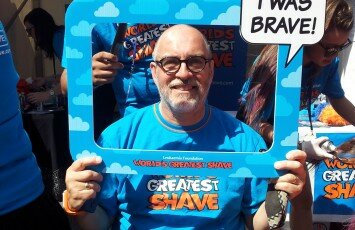 Michael Lewis shaved his head for the 12th time for the World's Greatest Shave event at Federation Square.
