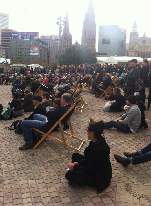 First to perform is contemporary trio The Bad Plus. As the music starts more and more people gather in Fed Square, with many taking a seat and settling in for the whole show and others pausing for just one song and then continuing with their busy days, the cold doing nothing to deter them.