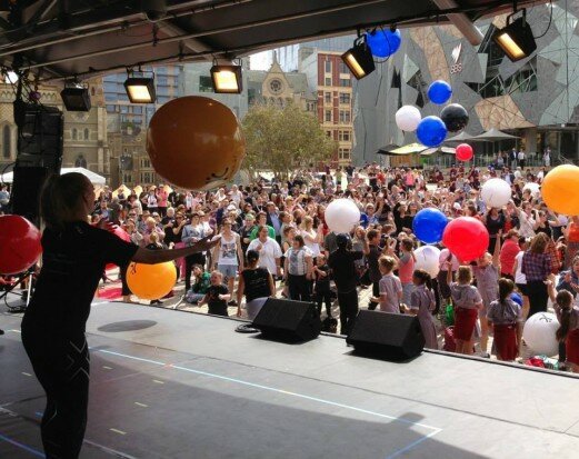 Showtime! The fun instantly began with the release of 70 large colourful balls bouncing in and above the crowd in time to energetic tunes. A delighted crowd couldn’t contain their laughter and participation. A diverse group of CBD workers, school groups, disability groups, tourists, family members and onlookers became one, pulled unconsciously together into the lunchtime fun.