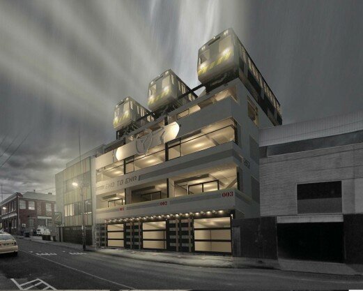The End To End complex, currently under construction in Collingwood follows up on this urban theme by integrating three current model Hitachi Met trains at rooftop level. Our office also has exciting projects in the planning stage, many of which have been designed using retro-fitted shipping containers as another way to repurpose objects and materials.
