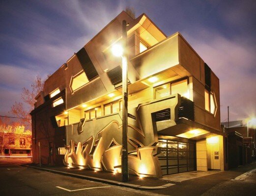 The Hive Graffiti Apartment development in Carlton allowed me to push the usual design boundaries and it has now gained some notoriety for its integration of street art and architecture. There is a tension in the composition where graffiti exists without paint and an ephemeral art is expressed in concrete, a ‘wild style’ letter E holds up four storeys of building.
