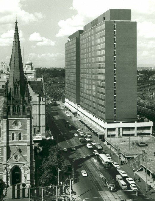 Wedged between the Victoria era built Flinders Street station and the Neo-Gothic style St Paul’s cathedral, the Internationalist style of the Gas and Fuel building resembled, albeit on a grander scale, the Greek and Italian homes that sat amid period homes in the suburbs of Richmond, Collingwood, Carlton, South Melbourne and North Melbourne.