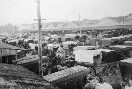 In 1878, the Market sheds G, H, I & J were built on the site and wholesaling and retailing of fruit and vegetables occurred for the first time. While H & I Sheds still stand, G Shed was removed to construct the current Meat Hall loading bay and a block of public toilets.
