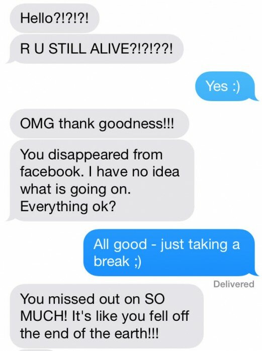 From my sister-in-law asking my husband if everything’s alright, to one of my Mum’s friends sending her a private facebook message to check on me, people have assumed I must be having a break-down to abandon Facebook.