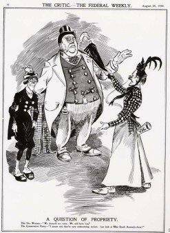 Image: ‘A question of propriety’, The Critic 26 August 1899: The Vic. Woman – “We demand our votes. We will have ‘em.” The Conservative Party – “I assure you they’re very unbecoming, ma’am. Just look at Miss South Australia there!”